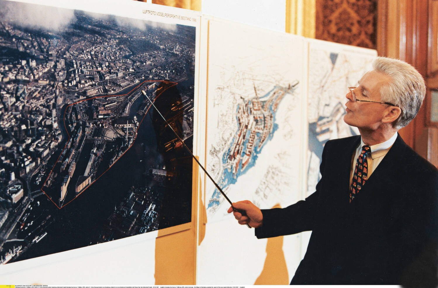 Heimlich vorbereitet: Als Hamburgs Erster Bürgermeister Henning Voscherau am 7. Mai 1997 die Pläne für eine „Hafen-City“ präsentierte, war die Öffentlichkeit überrascht. Nur einige Verbündete bei der HHLA wussten Bescheid.