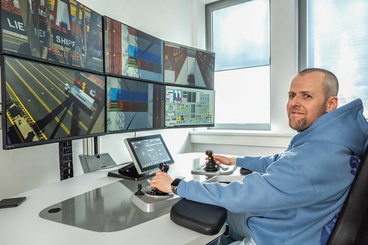 Herzstück des Trainingszentrums ist eine große Videowand mit sechs Bildschirmen, die zusammen mit Kontrollpulten als Leitstand dient. Ergänzend stehen Fernsteuerstände etwa für Containerbrücken, Lager- und Bahnkräne sowie ein Raum mit Virtual-Reality-Anwendungen für immersive Schulungen zur Verfügung. Der CTA ist mit den ma-co-Standorten in Hamburg und Bremen verbunden, sodass übergreifend in einer gemeinsamen virtuellen Umgebung trainiert werden kann. Die Forschungsinitiative IHATEC II des Bundesministeriums für Digitales und Verkehr (BMDV) fördert das Projekt, das ab Ende 2025 für die deutsche Hafenwirtschaft zugänglich sein soll. Parallel dazu läuft das Förderprogramm DigiRemote2030, mit dem die HHLA bereits die Weiterbildung der ersten 50 Containerbrückenfahrer gestartet hat. Sie wurden im Laufe des Jahres 2025 auf ihre neue Tätigkeit als Fernsteuerer vorbereitet. Nach intensiven Jobanalysen und Interviews mit den Beschäftigten starten ihre individuellen Trainingseinheiten. Immanuel Konschak vom CTA gehörte zu den Ersten.