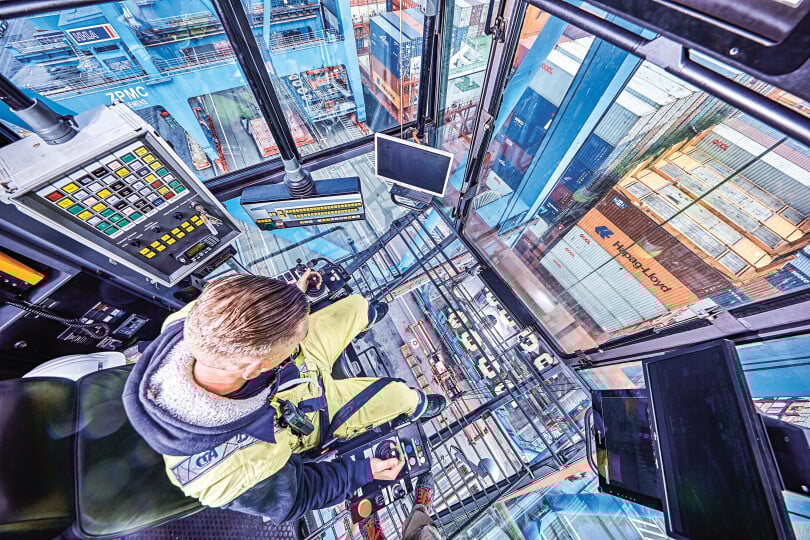 Der Winter im Hamburger Hafen kann ziemlich ungemütlich sein. Bei Temperaturen kurz über null Grad und heftigem Wind zieht es Immanuel Konschak nicht unbedingt an die Kaikante des Container Terminal Altenwerder (CTA). Statt in schwindelerregender Höhe in der Kanzel eines Containerkrans zu sitzen, arbeitet er heute im Warmen – vor mehreren Bildschirmen in einem modernen Fernsteuerstand. Seit 2007 ist Konschak im Hafen tätig und hat sich laufend weiterqualifiziert. Dank mehrerer „Patente“ genannter Befähigungsnachweise darf er verschiedene schwere Geräte führen. Sein nächstes Ziel: die Fernsteuerung von Containerbrücken. Noch trainiert Konschak an einem hochmodernen Simulator im digitalen Trainingszentrum des „maritimen competenzcentrums ma-co“. Doch die Zukunft ist bereits eingetroffen: Neue, ferngesteuerte Containerbrücken werden auf dem Terminalgelände zusammengesetzt, fast wie ein überdimensionierter Baukasten. Der größte Unterschied zu ihren Vorgängern: Sie haben keine Kanzel mehr für den Brückenfahrer. Stattdessen werden speziell ausgebildete Hafenarbeiter sie aus dem Fernsteuerstand im Bürogebäude steuern.