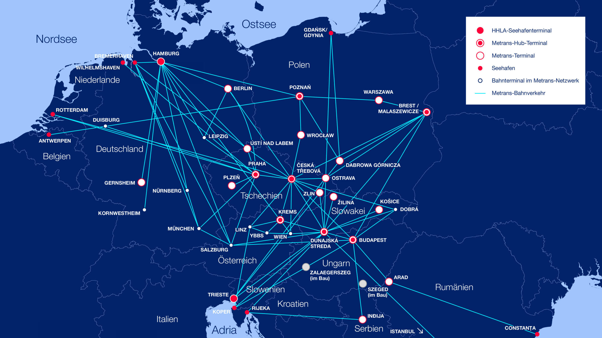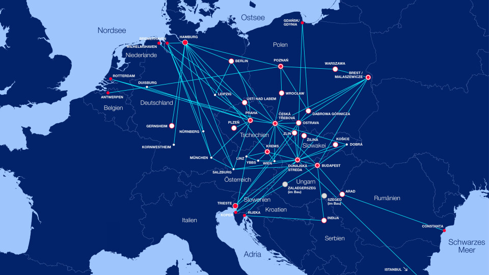 Zwischen Nord- und Ostsee, Adria und Schwarzem Meer hat die METRANS ein wachsendes Bahnnetz mit circa 650 Verbindungen pro Woche aufgebaut.